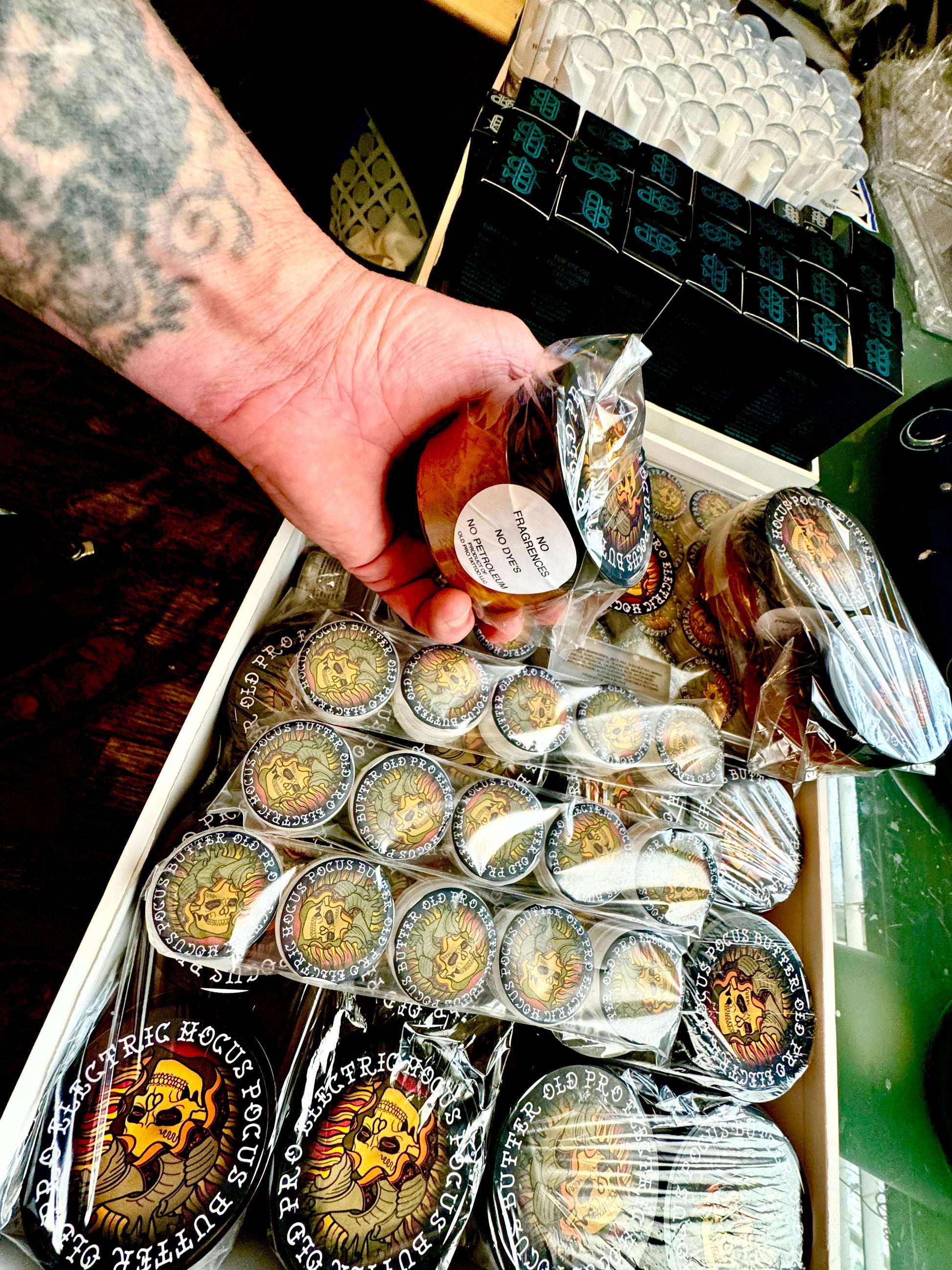 Old Pro Tattoo Electric Hocus Pocus Butter Mini's. It's ALL SMALL BATCH PRODUCED MINI GLIDE, SET OF 5 mini butters. For retail sales. These mini butters are a concentrated glide, crafted to provide deep healing, superior moisture, and maximum skin nourishment during the tattoo or new tattoos and beyond. Formulated by a veteran tattoo artist and developed in a medical-grade lab, this butter holds into the skin on contact, forming a breathable, protective layer that locks in hydration without clogging pores. dramatically improving the tattoo outcome. When used correctly doesn't allow ink to build up on skin during the tattoo process. Your Clients will notice the difference and you as the artist.